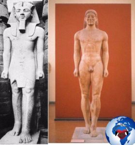 Vers la fin du VIIIe siècle, les architectes grecs tentaient de s’adapter au style Noir/Africain/Égyptien, non pas en l’imitant en détail, mais en l’adaptant à leurs formes architecturales locales. Ainsi est née en Grèce la colonne dorique qui a l’origine directe et immédiate de la colonne Noire/Africaine/Égyptienne.
