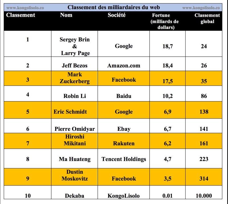 Les cofondateurs de Google Sergey Brin et Larry Page restent en haut du podium, suivis de Jeff Bezos et de Mark Zuckerberg et le dernier sur la liste “Dekaba” de KongoLisolo.